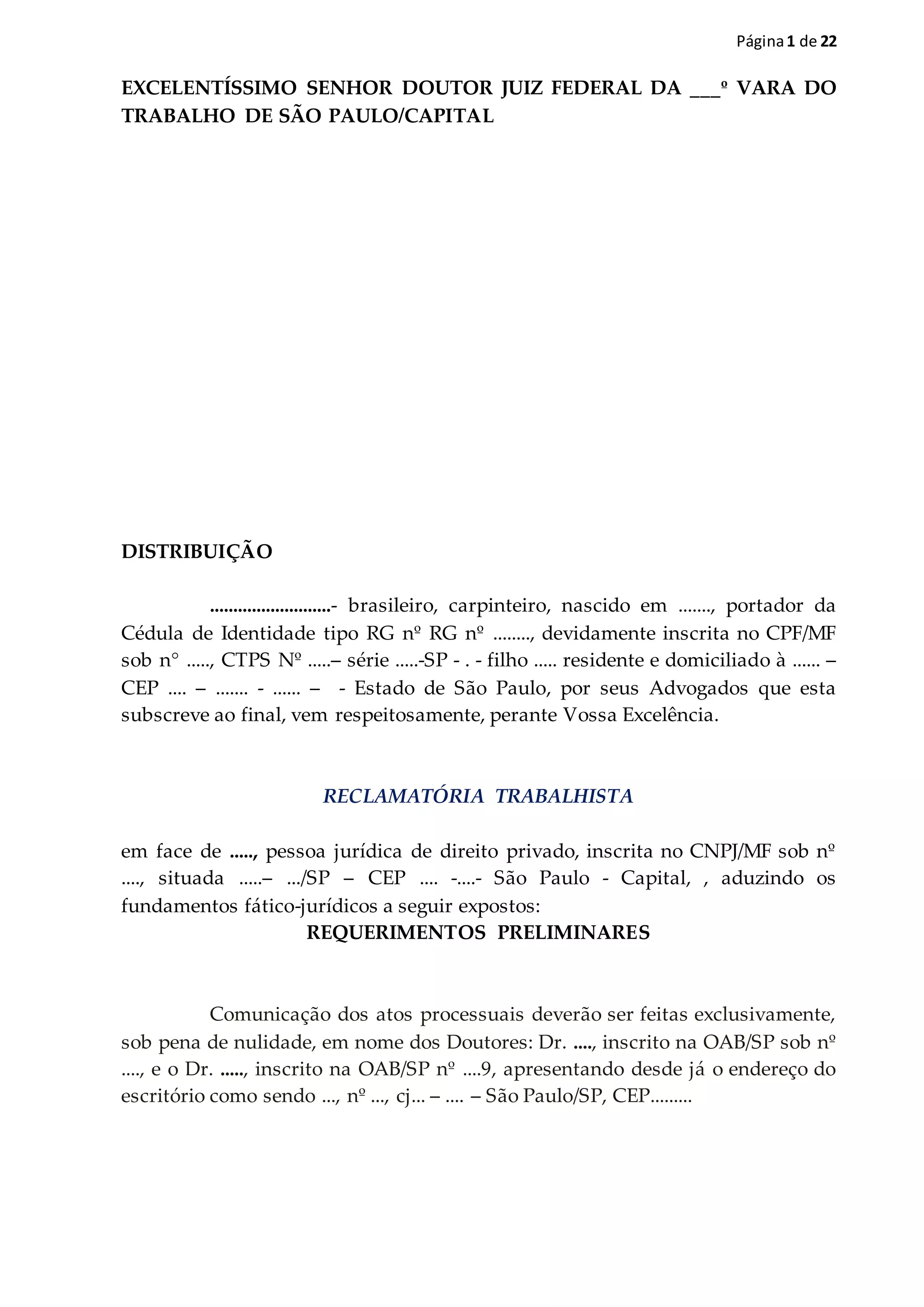 Este documento é uma reclamação trabalhista de um carpinteiro contra sua ex-empregadora. Ele alega que trabalhava além da jornada regular sem receber horas extras e que seu intervalo para refeição era frequentemente suprimido. Ele pede o pagamento de horas extras, verbas rescisórias e benefícios da justiça gratuita, alegando estar desempregado.
