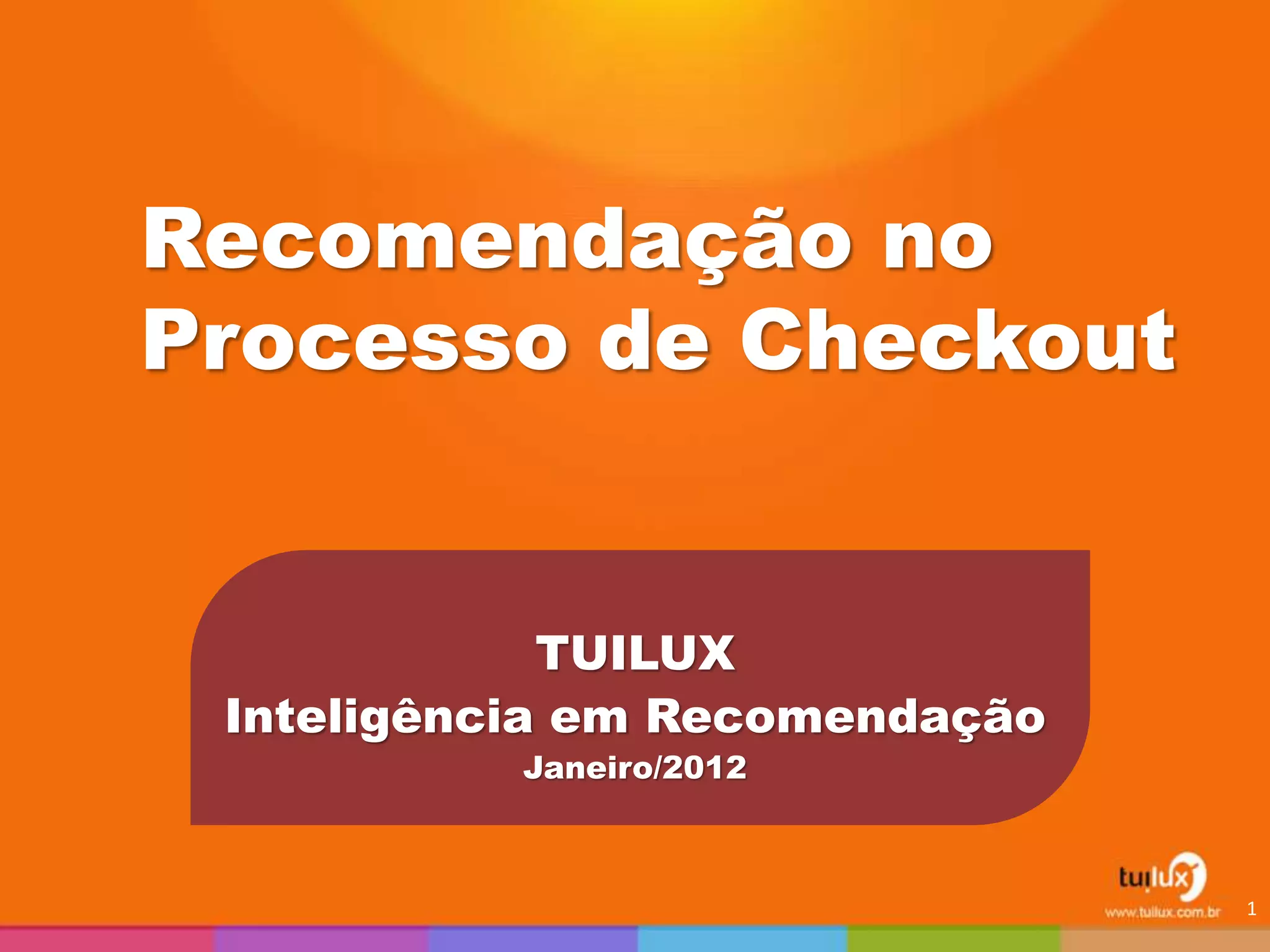 O documento discute o processo de checkout em e-commerces. Ele fornece dicas sobre como melhorar a taxa de conversão, analisa as práticas dos 100 maiores varejistas online dos EUA e discute como a recomendação pode ser usada no carrinho e no checkout.