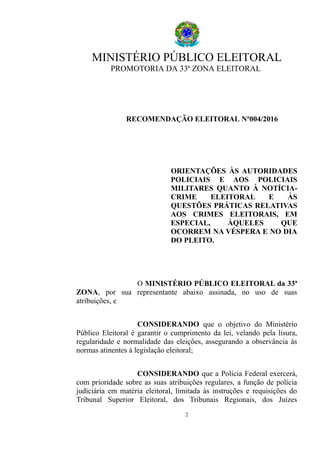 O documento é uma recomendação do Ministério Público Eleitoral da 33a Zona Eleitoral para autoridades policiais sobre crimes eleitorais. A recomendação orienta sobre como proceder em casos de notícia-crime eleitoral e crimes como retenção de título de eleitor, desordem que prejudique trabalhos eleitorais, impedir ou embaraçar voto, concentração de eleitores no dia da eleição e fornecimento de transporte ou alimentação a eleitores.