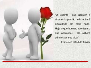 O documento discute a importância do perdão para o bem-estar espiritual e físico. Aborda passos para o perdão, como inicialmente enxergar o ofensor como necessitado de ajuda e depois desenvolver simpatia e fraternidade. Também destaca que pensamentos negativos como ódio podem produzir doenças, enquanto o perdão traz harmonia mental e física.