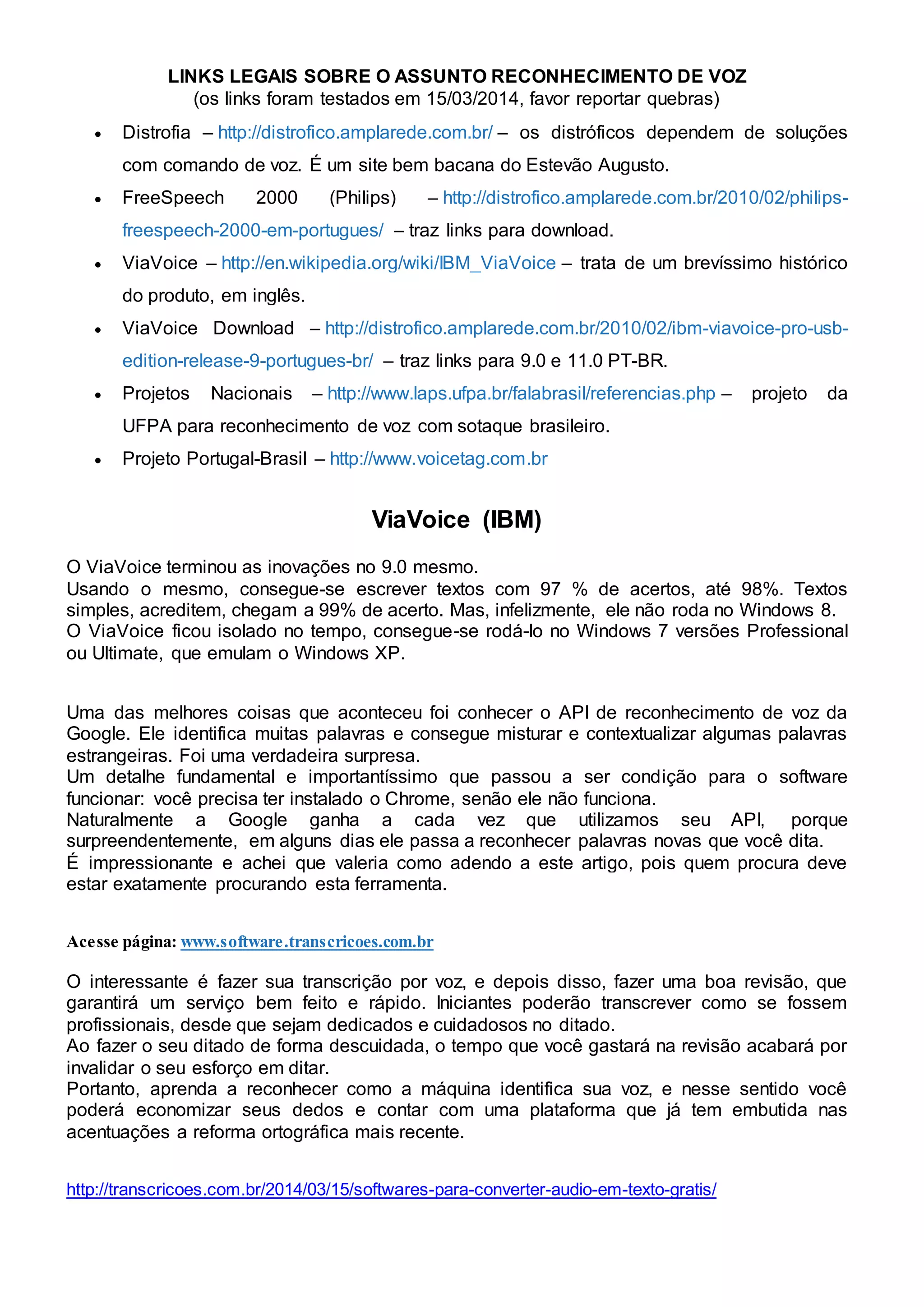 O documento lista links sobre reconhecimento de voz e discute o software ViaVoice da IBM. Também menciona o API de reconhecimento de voz da Google e enfatiza a importância de revisar transcrições feitas por voz.