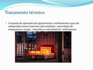O documento discute tratamentos térmicos como recozimento e normalização. Ele explica que o recozimento é usado para aliviar tensões, tornar o material mais maleável e dúctil, enquanto a normalização é usada para refinar a granulação grosseira do aço. Ambos os processos envolvem aquecimento controlado, manutenção da temperatura e resfriamento lento.
