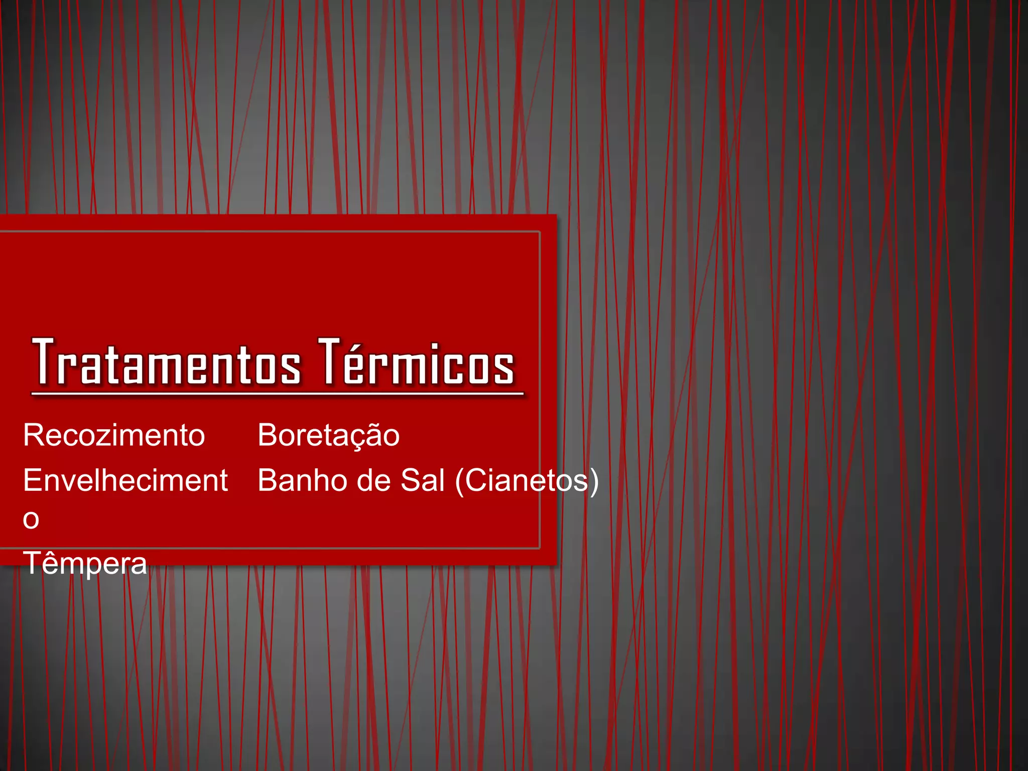O documento descreve vários processos de tratamento térmico de metais, incluindo recozimento, envelhecimento, têmpera, boretação e banho de sal. Recozimento é usado para aliviar tensões e controlar propriedades, enquanto têmpera aumenta dureza aquecendo e resfriando rapidamente. Boretação e banho de sal criam superfícies mais resistentes à abrasão difundindo átomos na superfície.