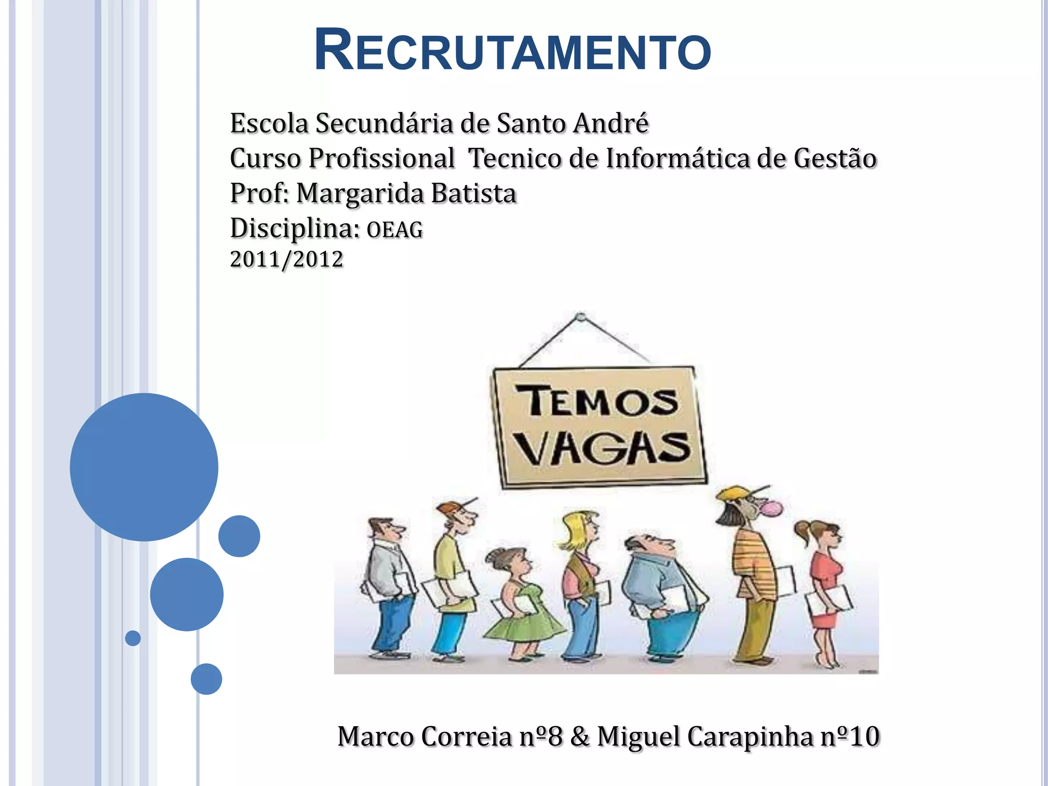 Este documento discute os processos de recrutamento e seleção em organizações. Ele explica os objetivos do recrutamento, as fontes de recrutamento interno e externo, e os métodos e formas de entrevista utilizados na seleção de candidatos. O documento fornece também referências bibliográficas sobre esses tópicos.