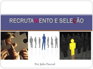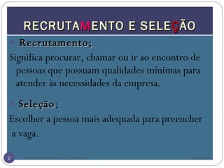 O documento discute os processos de recrutamento e seleção de funcionários, definindo recrutamento como a busca por candidatos qualificados e seleção como a escolha do candidato mais adequado. Também aborda tópicos como a ordem dos processos de seleção, tipos de entrevista, dicas para entrevistas e lembretes finais.