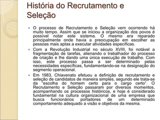 O documento discute o histórico e os processos de recrutamento e seleção. Apresenta as definições de recrutamento e seleção, suas etapas, técnicas e formas. Também discute os tipos de recrutamento, princípios, vantagens do recrutamento externo e o processo de recrutamento antes e depois.