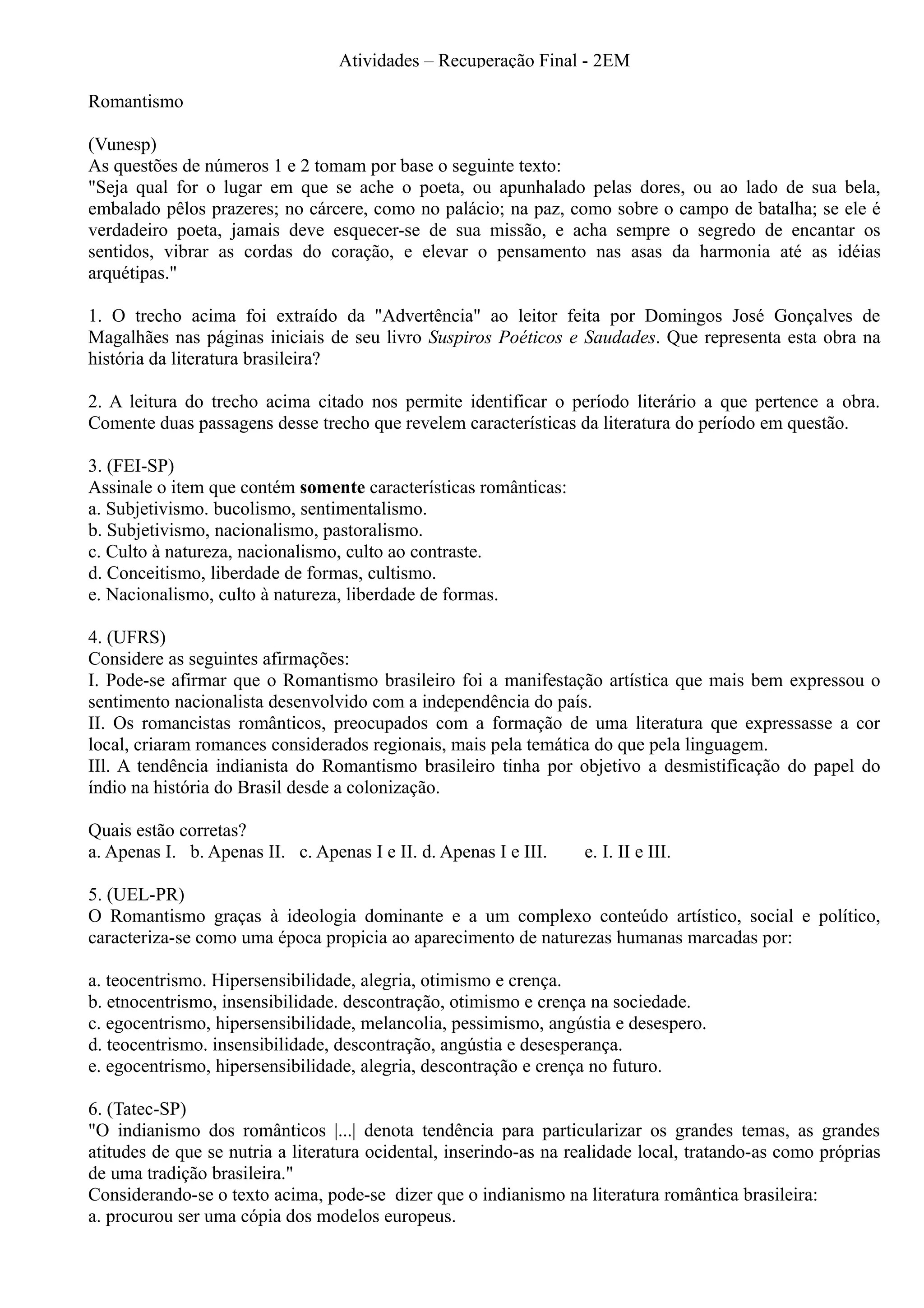 O documento apresenta questões sobre o Romantismo brasileiro. A primeira questão aborda a obra Suspiros Poéticos e Saudades de Domingos José Gonçalves de Magalhães, que representa o marco inicial do Romantismo no Brasil. As outras questões tratam de características da literatura romântica brasileira como o sentimento nacionalista, o culto à natureza e o indianismo.