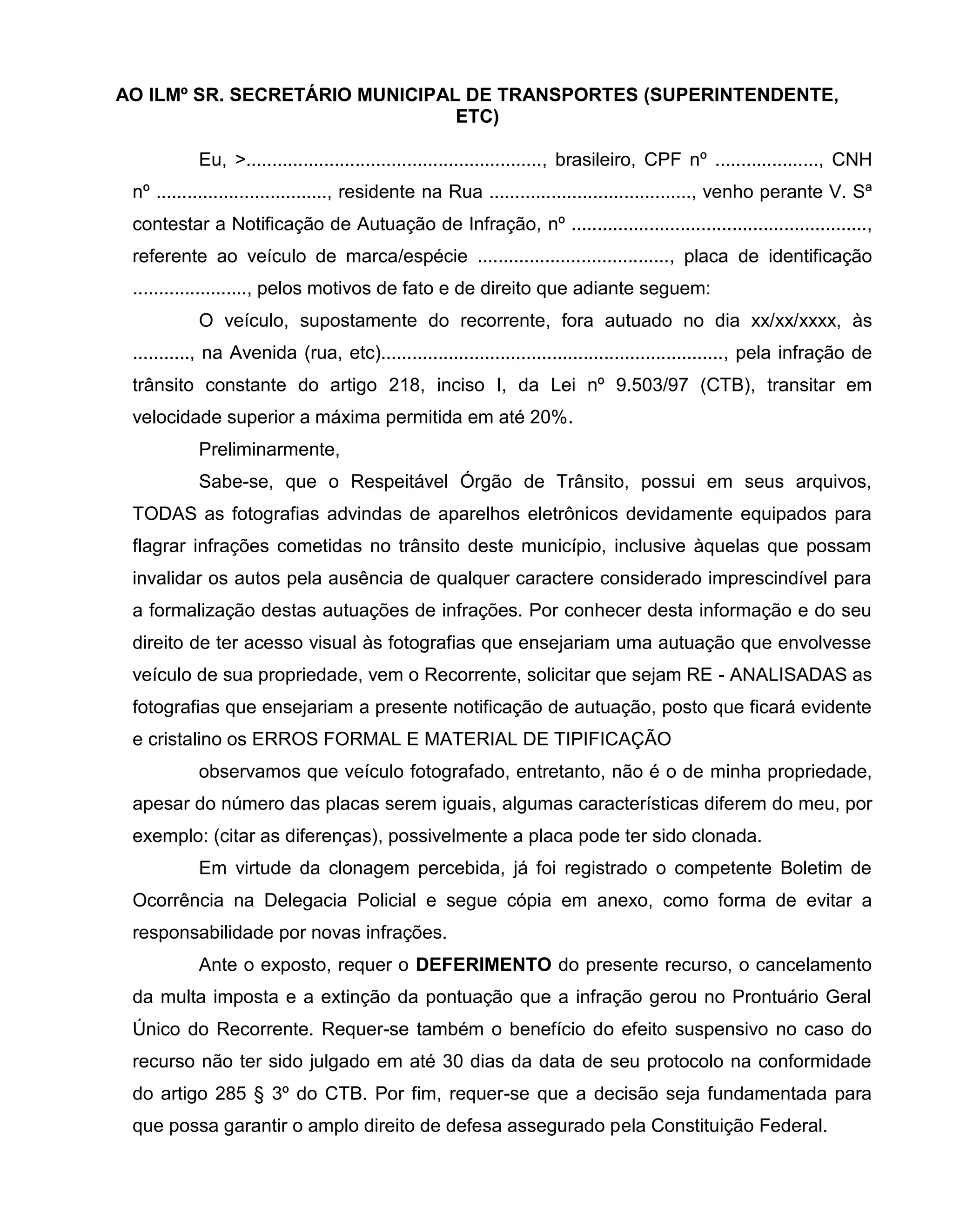 O condutor contesta uma multa por excesso de velocidade alegando que o veículo fotografado, apesar de ter placas iguais, apresenta diferenças em relação ao seu e que possivelmente teve a placa clonada. Ele solicita que sejam reanalisadas as fotografias e o cancelamento da multa caso comprovada a clonagem de placa.