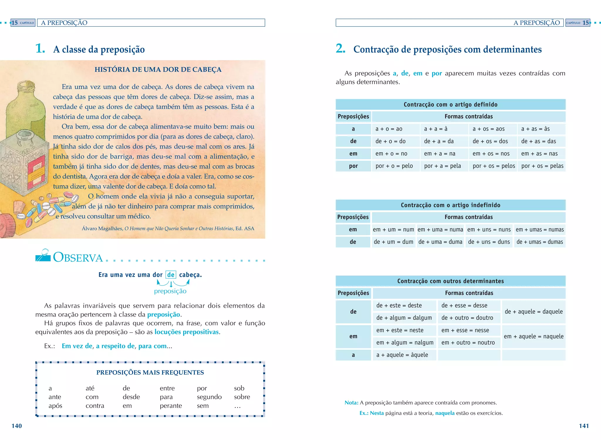 Este documento descreve a história de uma dor de cabeça que vivia na cabeça de um homem e o atormentava constantemente. O homem já não aguentava mais as dores e não tinha mais dinheiro para comprar remédios, então decidiu consultar um médico. O documento também explica as principais preposições em português e como elas podem aparecer contraídas com artigos e outros determinantes.