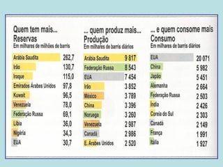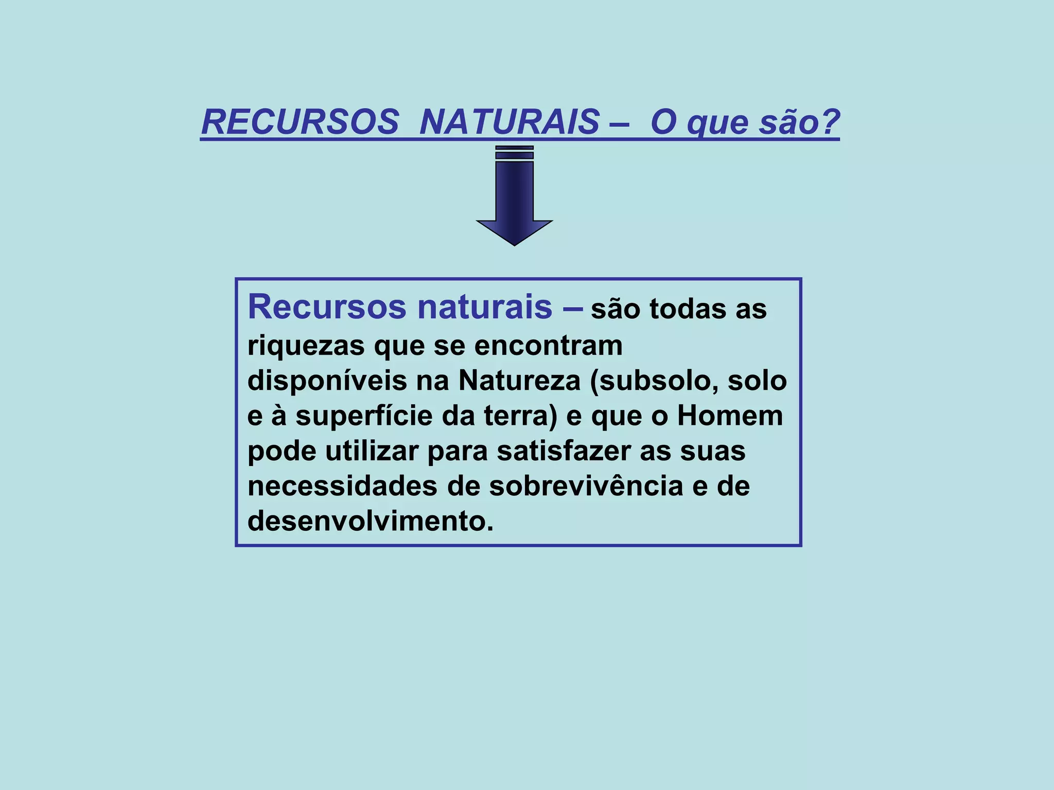 O documento discute os recursos naturais, classificando-os em renováveis e não renováveis. Os recursos não renováveis como combustíveis fósseis e minerais estão se esgotando rapidamente devido ao aumento do consumo de energia. As energias renováveis como solar, eólica e hidrelétrica oferecem alternativas sustentáveis.