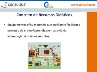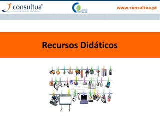 O documento discute recursos didáticos e sua utilização no processo de ensino-aprendizagem. Define recursos didáticos como equipamentos ou materiais que auxiliam a estimulação dos sentidos e facilitam a aprendizagem. Descreve funções de recursos didáticos, vantagens do seu uso, critérios de seleção, características e classificações de recursos. Fornece detalhes sobre o uso de quadros, documentos gráficos, retroprojetores, câmeras de vídeo e videoprojetores.
