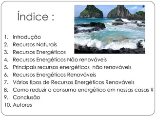O documento discute os recursos energéticos renováveis e não renováveis, incluindo suas definições, exemplos principais, vantagens e desvantagens. Ele fornece detalhes sobre como reduzir o consumo de energia em casa e conclui que as energias renováveis poluem menos e são mais baratas que as não renováveis.