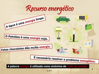 O documento discute os recursos energéticos, incluindo fontes renováveis e não renováveis. Historicamente, fontes como animais, madeira e água foram usadas, mas a Revolução Industrial exigiu novas fontes como carvão. Combustíveis fósseis como carvão, petróleo e gás natural, embora tenham levado milhões de anos para se formar, estão sendo consumidos rapidamente. Isso traz consequências como esgotamento dos recursos e impactos ambientais e de saúde. Energia nuclear também é discutida.