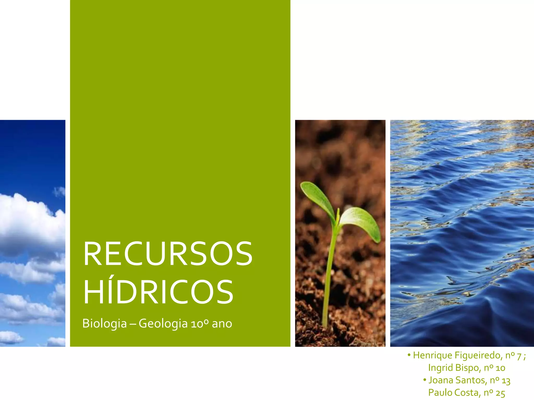 Este documento discute os recursos hídricos no planeta, incluindo a distribuição e disponibilidade de água doce e salgada, as principais fontes de poluição das águas, e as consequências da exploração excessiva das águas subterrâneas. Também fornece dicas para preservar a qualidade da água e a importância do tratamento de águas residuais.