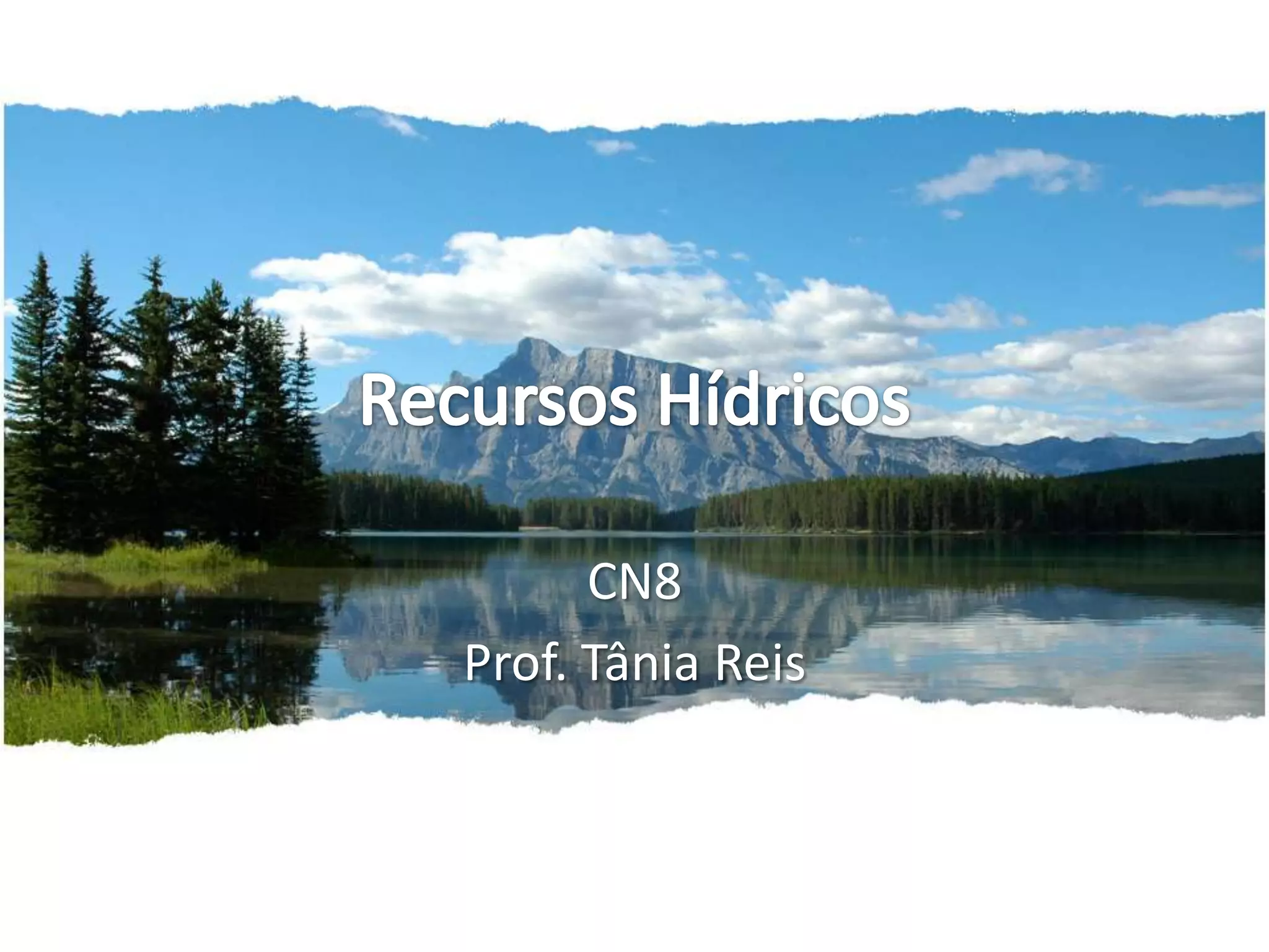 O documento discute os recursos hídricos da Terra, incluindo que apenas 2,5% da água da Terra é doce e disponível, e que as atividades humanas ameaçam a qualidade da água através da poluição. Ele também define os tipos de água, incluindo água potável, águas minerais naturais, de nascente e termais.