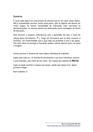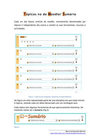 1) Cada tópico no Moodle é independente e contém ferramentas como recursos e atividades. 2) Os tópicos são representados por retângulos azuis e cada um pode ter um sumário. 3) O sumário fornece uma breve síntese do assunto tratado no tópico e não deve ser muito longo.