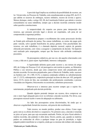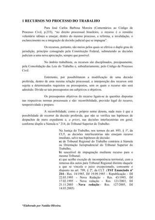 O documento discute os recursos no processo do trabalho, definindo-os como meios para se efetivar o duplo grau de jurisdição. Apresenta os pressupostos objetivos e subjetivos para a interposição de recursos e explica as diferentes modalidades de recursos cabíveis no direito trabalhista, como embargos, agravo regimental, recurso ordinário e recurso extraordinário.