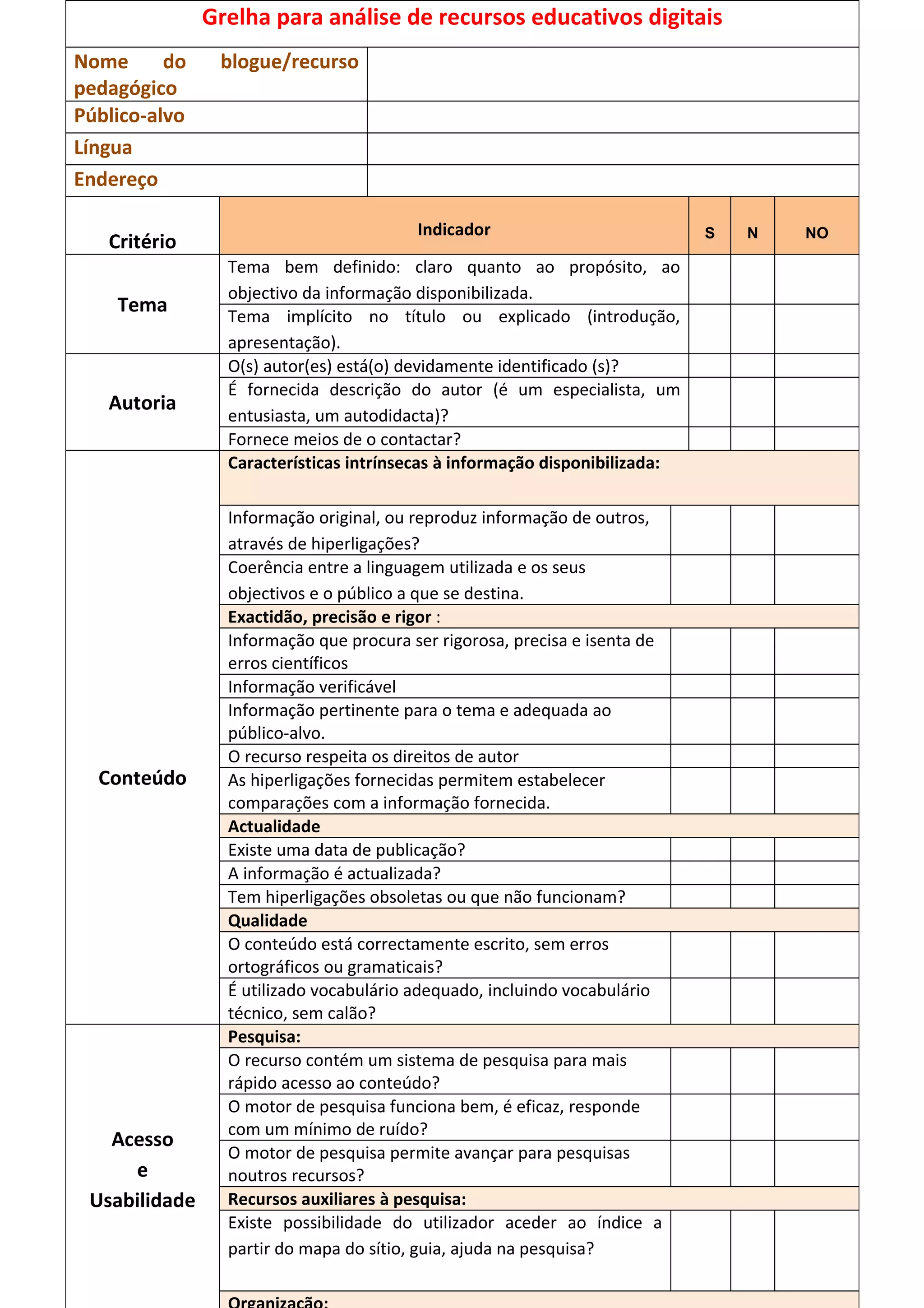 Este documento fornece uma grelha para analisar recursos educativos digitais, avaliando critérios como o tema, a autoria, o conteúdo, a actualidade, a qualidade, o acesso e a usabilidade. A grelha inclui indicadores para verificar se cada critério é satisfeito, não é satisfeito ou não é aplicável.