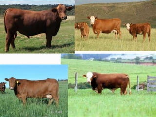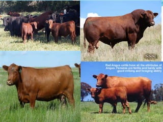 O documento descreve a raça bovina Red Angus, originária da Escócia. A raça surgiu no século XX a partir de animais da raça Angus preta e é mais resistente a carrapatos e ao clima quente. O Angus se destaca por sua alta fertilidade, precocidade e produzir carne de alta qualidade, levemente marmoreada e macia.