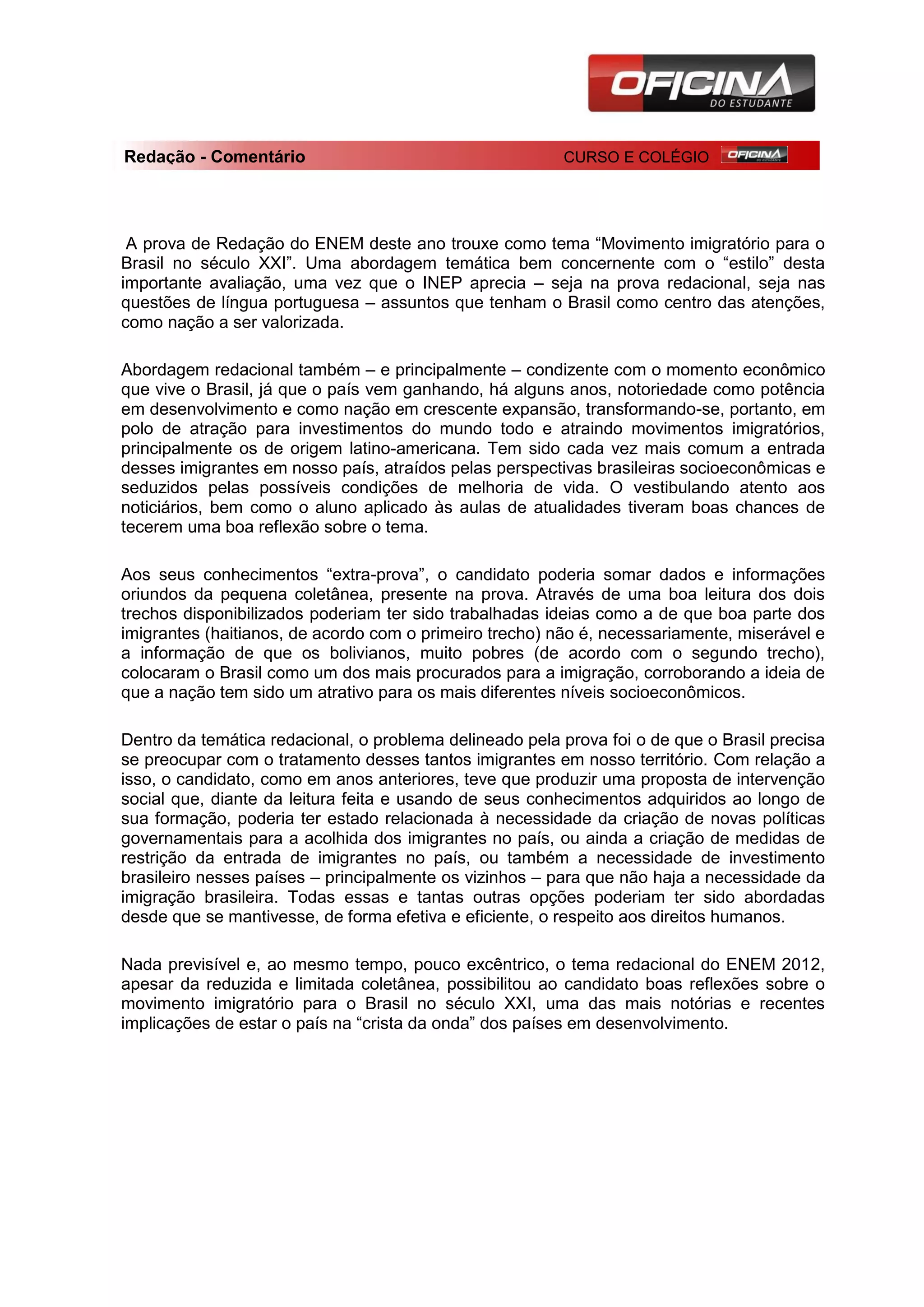 O documento resume a prova de redação do ENEM de 2012, que teve como tema "Movimento imigratório para o Brasil no século XXI". O texto discute que o tema foi apropriado pois reflete a importância do Brasil como nação e seu crescimento econômico, atraindo imigrantes, principalmente da América Latina. O candidato poderia ter discutido propostas de novas políticas de acolhida ou restrição de imigrantes, desde que respeitando os direitos humanos.