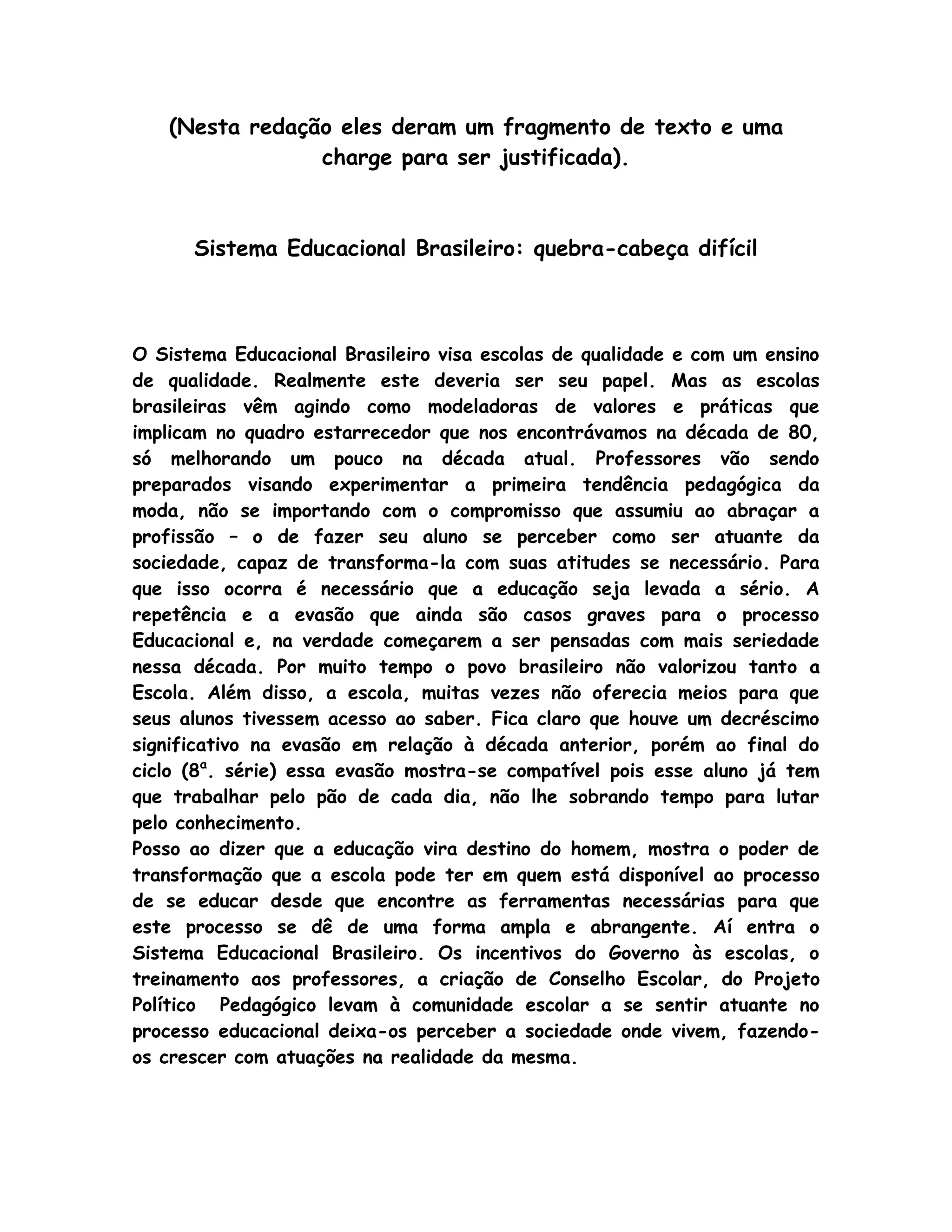 O texto descreve os desafios do sistema educacional brasileiro, incluindo altas taxas de evasão escolar e repetência. Argumenta que é necessário levar a educação mais a sério para preparar estudantes a transformarem ativamente a sociedade, e que iniciativas do governo para incentivar escolas e treinar professores podem ajudar nisso.