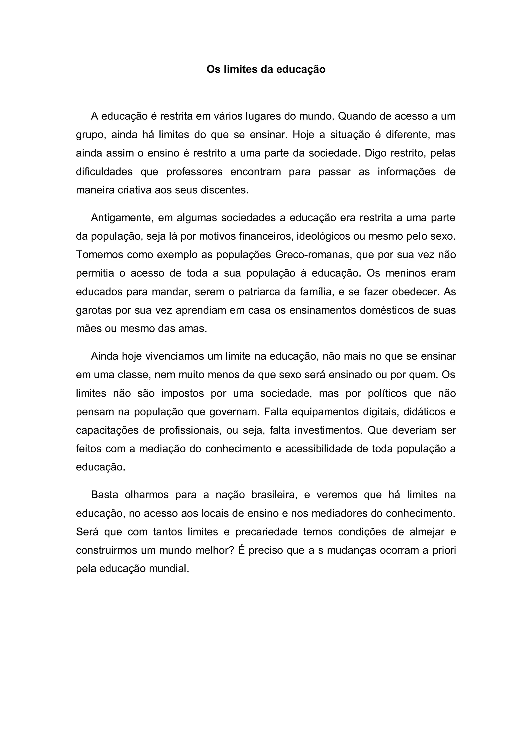 A educação sempre teve limites em várias sociedades, restringindo o acesso a determinados grupos. Ainda há limites hoje devido à falta de investimento em equipamentos, capacitação de professores e acesso de toda a população. É preciso remover esses limites através da educação para construir um mundo melhor.