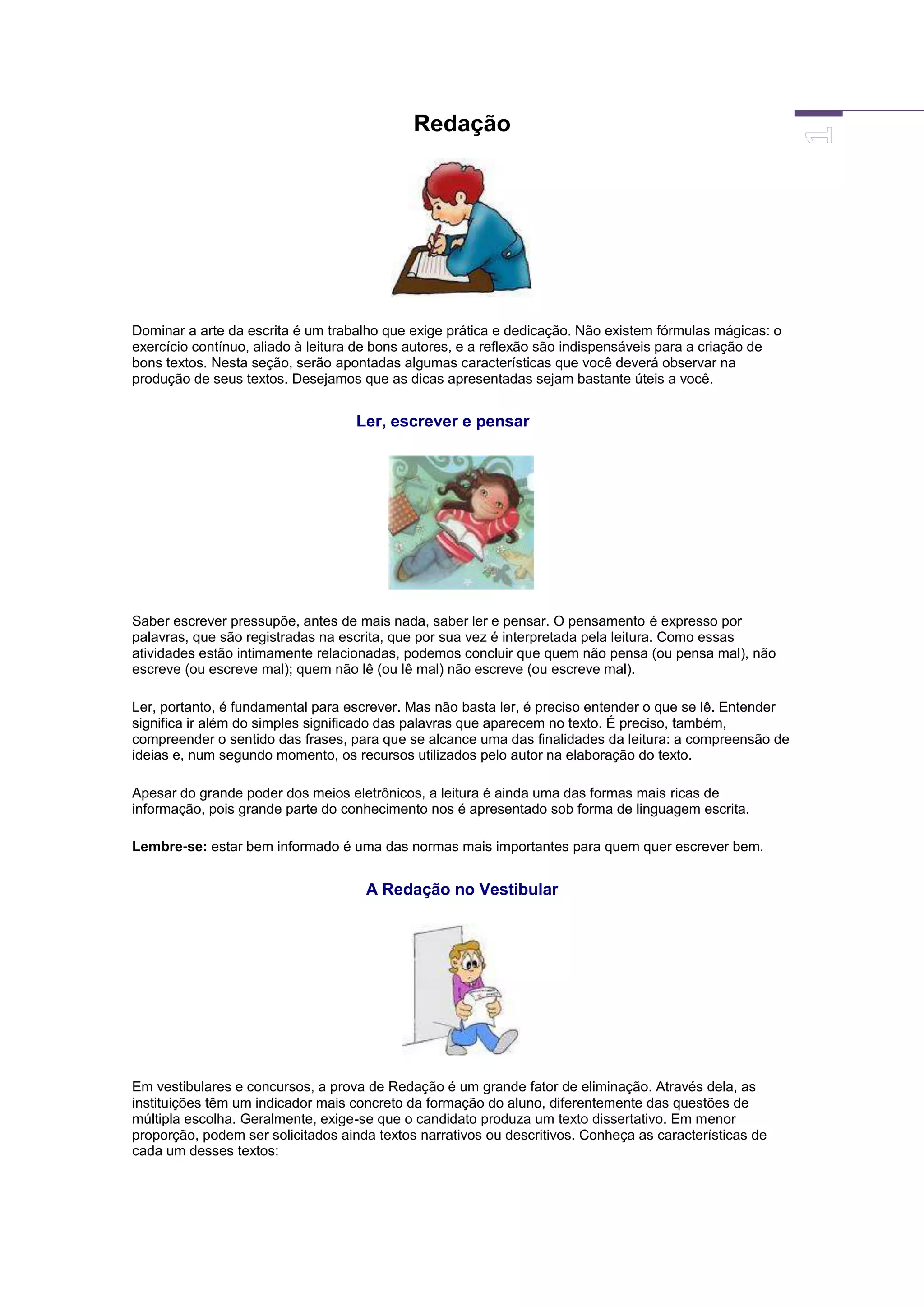 O documento fornece dicas sobre como produzir bons textos, enfatizando a importância da leitura, escrita e pensamento. Também discute estruturas de redação como introdução, desenvolvimento e conclusão. Por fim, oferece conselhos sobre como planejar e escrever uma boa redação.