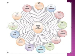 O documento discute o uso de blogs como rede de interação para socialização e construção de conhecimento entre a Coordenadoria de Tecnologia na Educação, Núcleos de Tecnologia na Educação e escolas. O objetivo é estabelecer uma rede de comunicação interativa através de ferramentas multimídias para compartilhar trabalhos. A rede proposta é distribuída para permitir conexões igualitárias entre os membros e apoiar o capital social cognitivo e institucional do grupo.