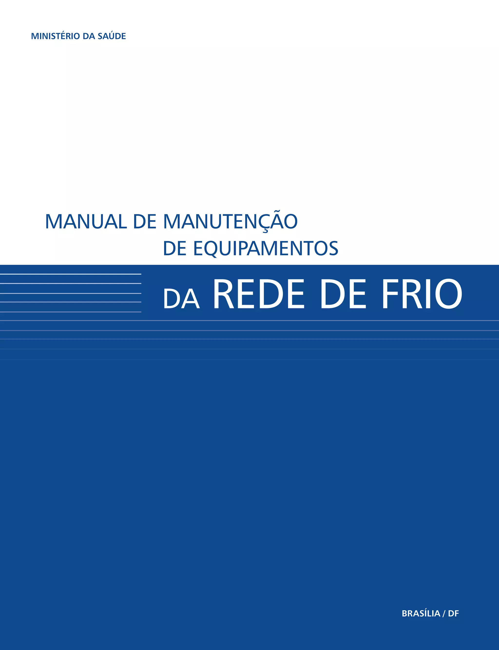 Este documento fornece informações sobre o Manual de Manutenção de Equipamentos da Rede de Frio do Ministério da Saúde do Brasil. O manual orienta sobre procedimentos de manutenção preventiva e corretiva de equipamentos como refrigeradores, câmaras frias, condicionadores de ar e geradores usados para armazenar imunobiológicos. Além disso, fornece diretrizes sobre a estrutura organizacional, planejamento, execução e controle das atividades de manutenção.