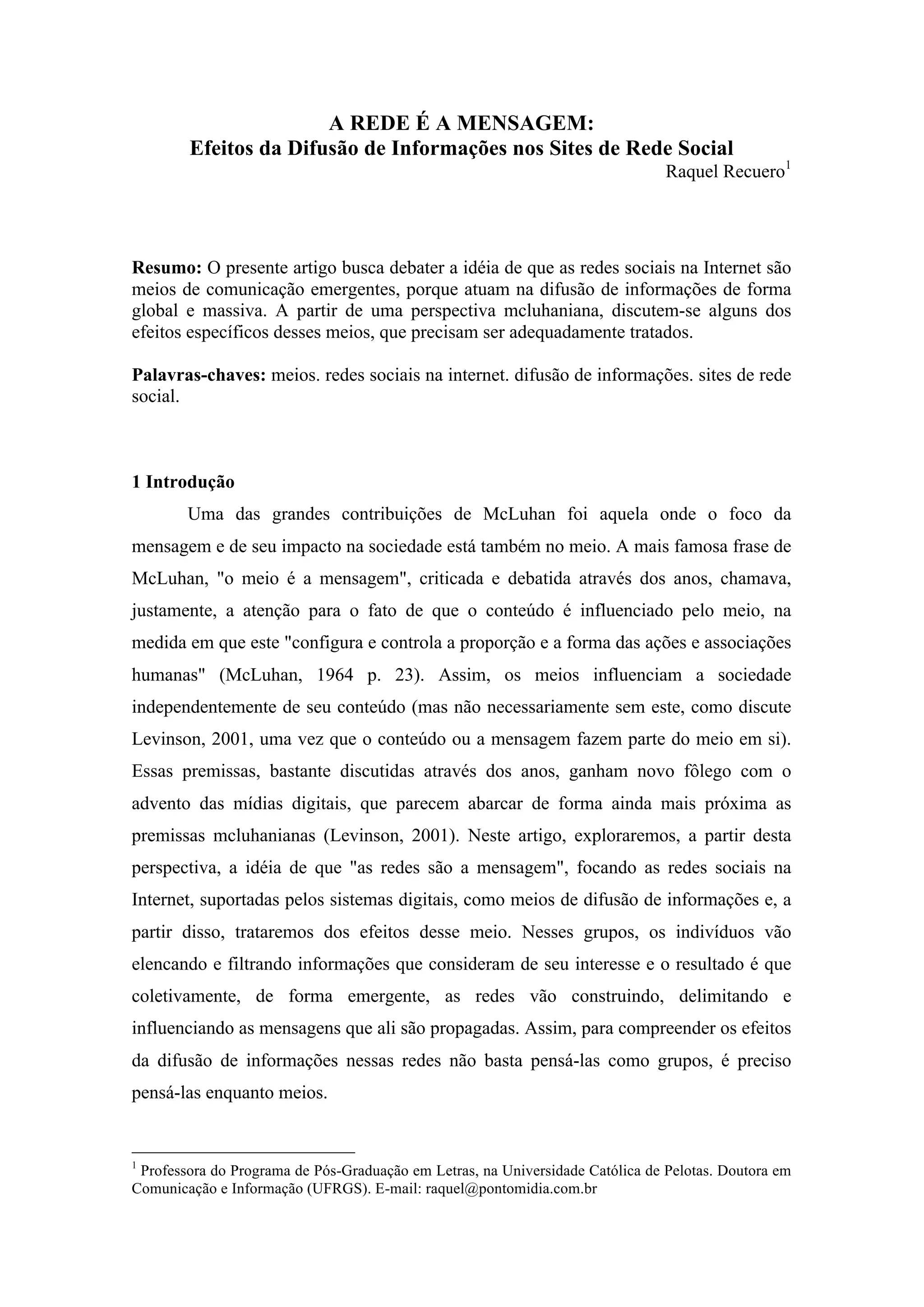 O documento discute como as redes sociais na internet funcionam como meios de comunicação que difundem informações de forma global e em massa. O autor argumenta que essas redes precisam ser entendidas não apenas como grupos, mas principalmente como meios que influenciam a sociedade e possuem efeitos específicos, como a ampliação das redes de contatos e a circulação de informações.