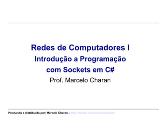 O documento discute programação de sockets em C# para comunicação em rede. Apresenta as classes Socket e IPAddress para representar sockets e endereços IP, respectivamente. Também explica como criar sockets servidores e clientes, estabelecer conexões, enviar e receber dados usando os métodos Bind, Listen, Accept, Receive e Send.