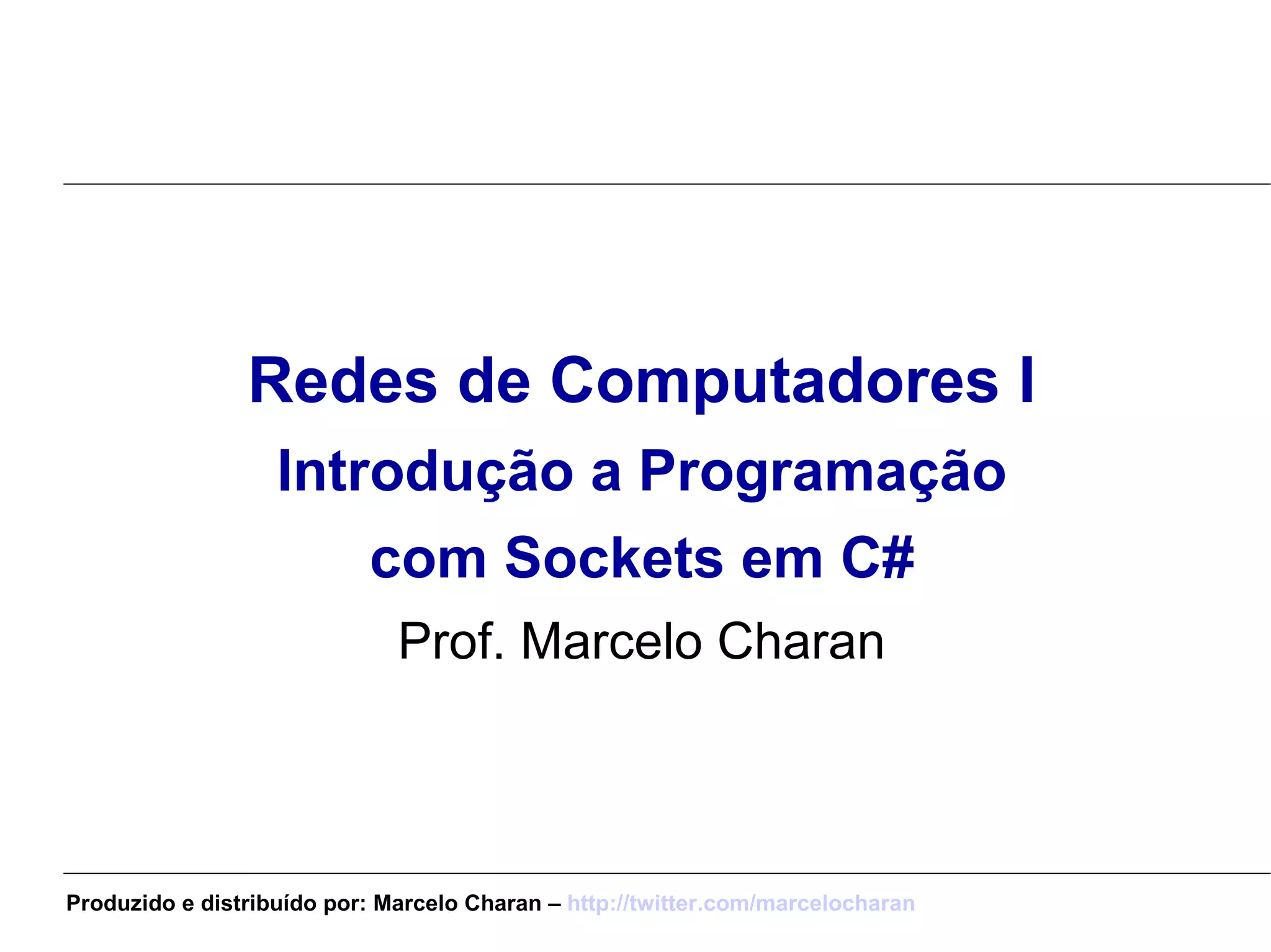 O documento discute programação de sockets em C# para comunicação em rede. Apresenta as classes Socket e IPAddress para representar sockets e endereços IP, respectivamente. Também explica como criar sockets servidores e clientes, estabelecer conexões, enviar e receber dados usando os métodos Bind, Listen, Accept, Receive e Send.