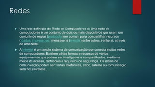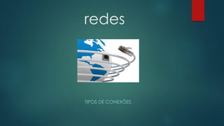 O documento discute os tipos de redes de computadores e conexões. Ele define uma rede como um conjunto de dispositivos que compartilham recursos através de um conjunto comum de regras. As redes incluem LANs, MANs e WANs. Os tipos de conexão mencionados são dial-up, xDSL, cabo, Wi-Fi, rádio e 3G.