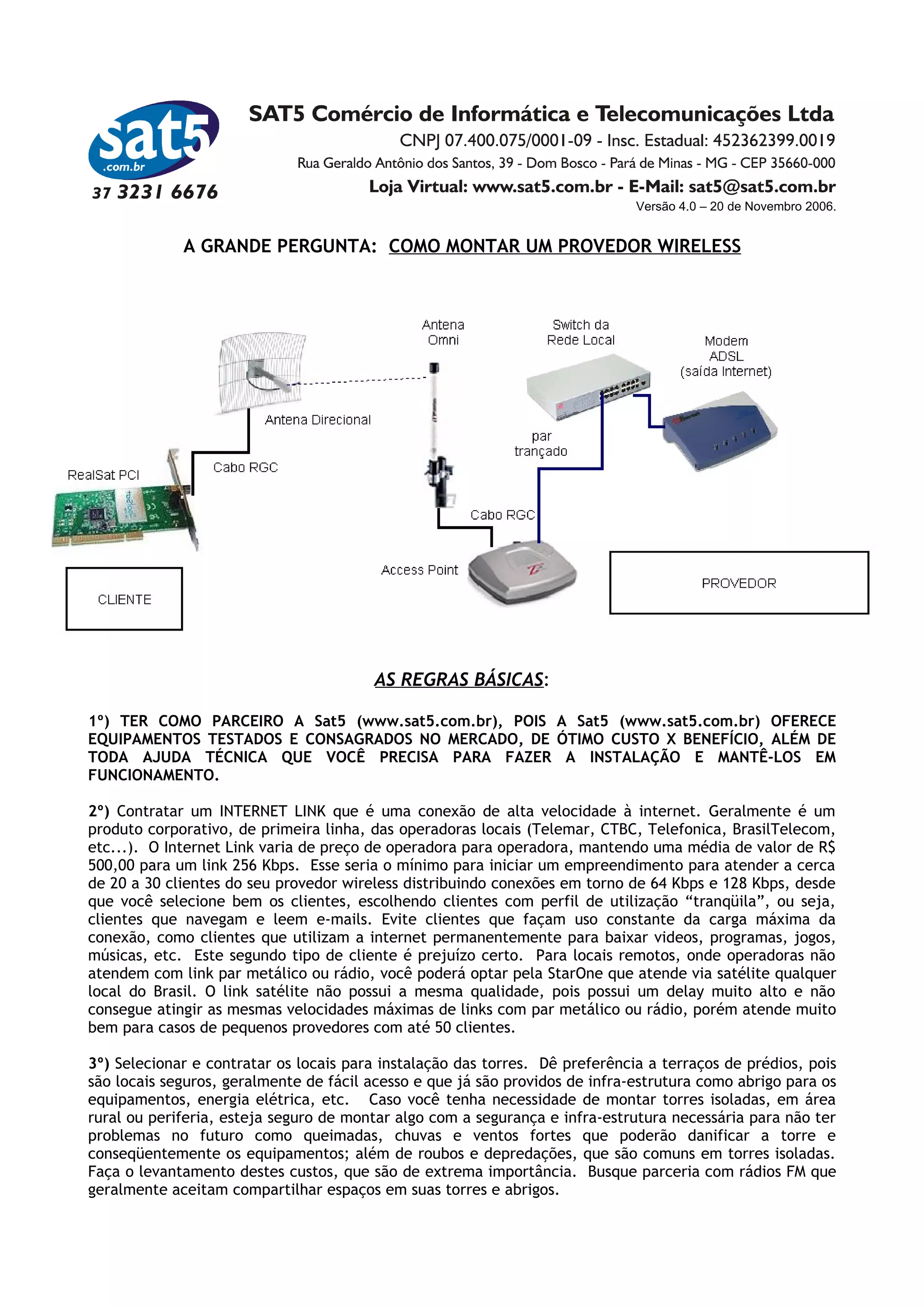 3) Para iniciar, é recomendado um link de 256kbps, access point Zinwell G120, antena Aquário 12dBi e kits clientes da Sat5