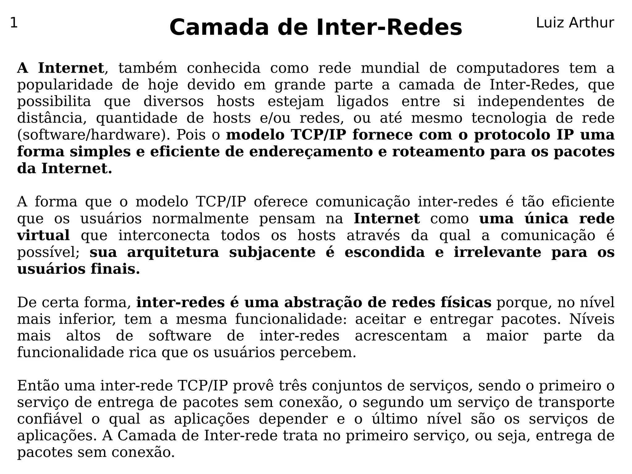 O documento explora a camada de inter-redes do modelo TCP/IP, destacando sua importância para a comunicação na internet através do protocolo IP. Ele discute o funcionamento do serviço de entrega sem conexão e não confiável, a estrutura do datagrama IPv4 e seus campos, além da fragmentação necessária para que os datagramas se ajustem nas diferentes MTUs das redes. A complexidade do campo de tipo de serviço (ToS) e suas limitações na priorização de pacotes também são abordadas.
