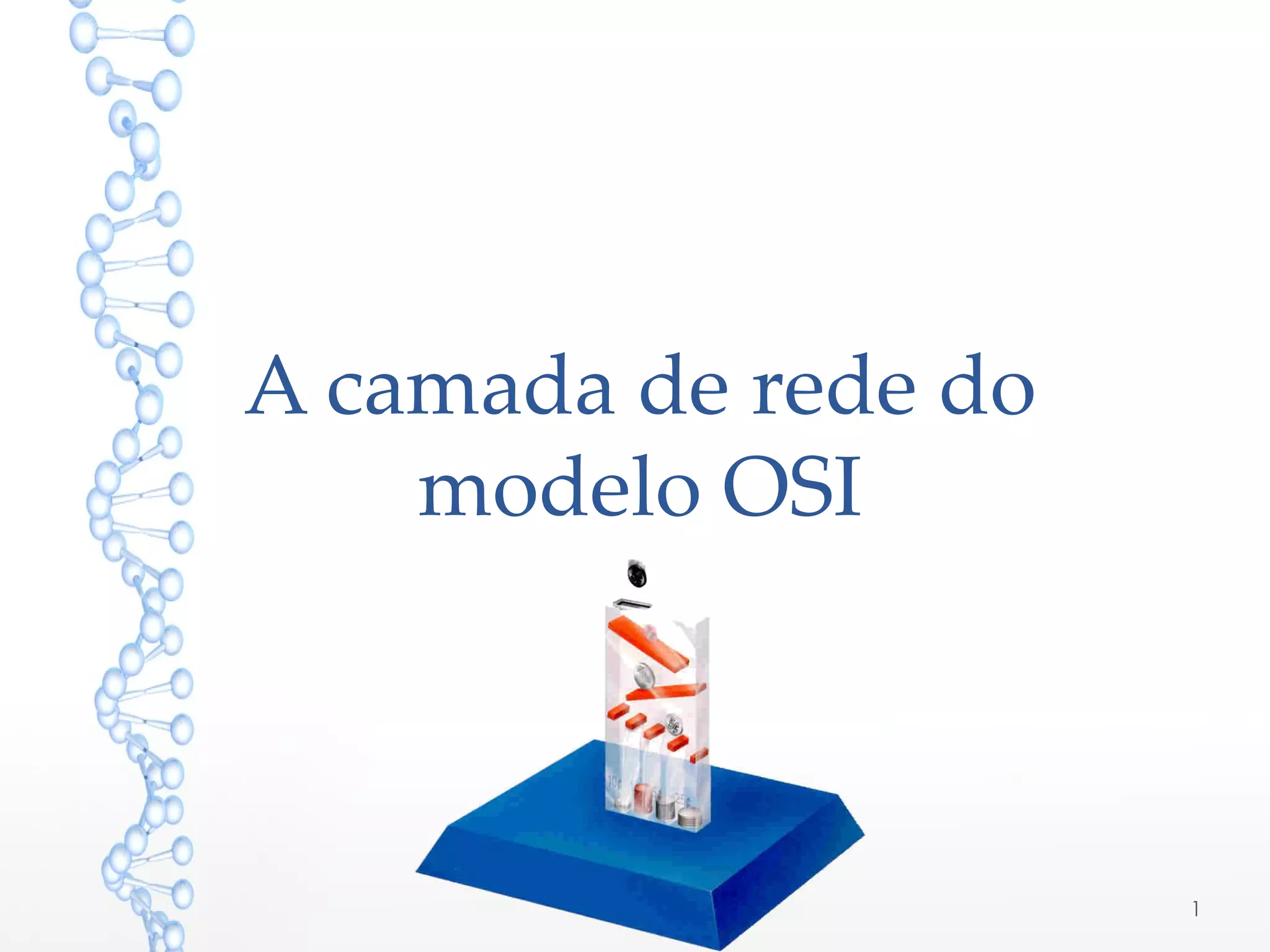 A camada de rede do modelo OSI realiza o endereçamento e encaminhamento de mensagens entre dispositivos de rede, podendo dividir mensagens em pacotes. Routers e portas de interface de routers direcionam o tráfego entre redes. Protocolos como NAT permitem que múltiplos dispositivos compartilhem um único endereço IP público.