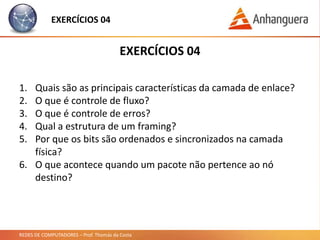 A camada de enlace possui características como controle de fluxo e controle de erros. Um framing possui uma estrutura para ordenar e sincronizar bits na camada física. Quando um pacote não pertence ao nó destino, ele é descartado.
