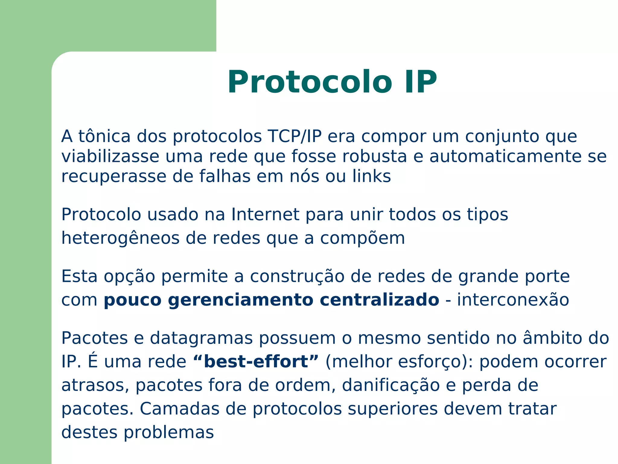 O documento descreve os protocolos TCP/IP, especificamente o protocolo IP. O IP interconecta redes heterogêneas, permite a construção de grandes redes com pouco gerenciamento centralizado e é uma rede "best-effort" onde podem ocorrer atrasos e perda de pacotes. O IP define o formato dos pacotes e algoritmos de encaminhamento entre hosts em redes diferentes.