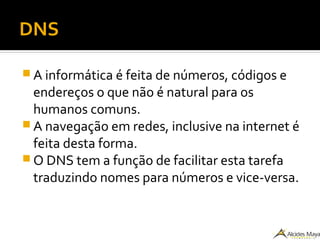 O documento descreve o sistema de nomes de domínio (DNS), que traduz nomes de domínio para endereços IP de forma hierárquica. O DNS é distribuído entre servidores raiz, de domínio de topo e autoritativos para melhor desempenho e confiabilidade. Servidores locais e caches também melhoram o desempenho ao armazenar respostas para requisições futuras.