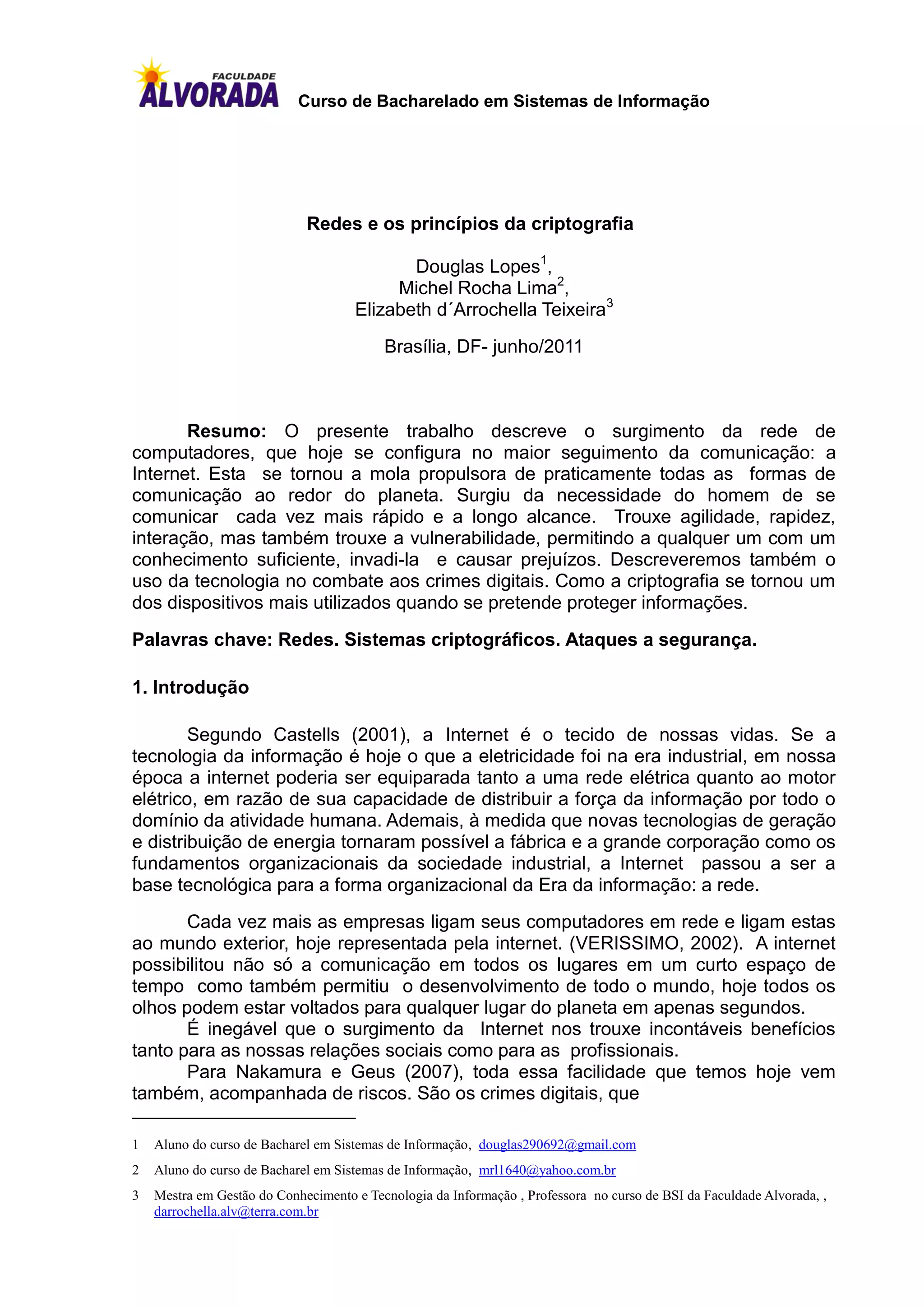 O documento aborda o surgimento das redes de computadores e a importância da criptografia para a segurança das informações na era da internet. Discute os benefícios e riscos associados aos crimes digitais, destacando a vulnerabilidade dos sistemas de segurança e a necessidade de soluções contínuas para proteção. A criptografia é apresentada como um elemento central na proteção de dados, com diferentes métodos e técnicas de segurança sendo fundamentais para a privacidade e integridade das comunicações.