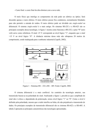 O documento discute os protocolos Profibus e Ethernet, redes industriais de comunicação e controle, incluindo os barramentos de campo AS-i e Bitbus. Também aborda o uso da fibra ótica em redes industriais, destacando suas vantagens como imunidade a ruído e maior velocidade, mas também seus desafios como atenuação e custo mais elevado.