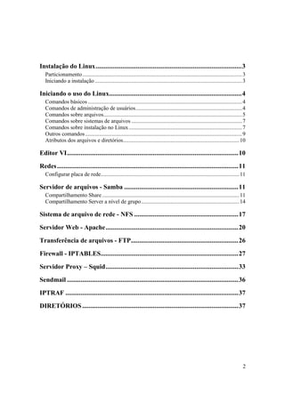 O documento fornece instruções sobre comandos de rede e servidores de rede no Linux. Ele abrange tópicos como configuração de placas de rede, compartilhamento de arquivos via Samba e NFS, servidores web Apache, FTP e firewall IPTables. O documento também inclui comandos gerais do Linux e editores de texto.