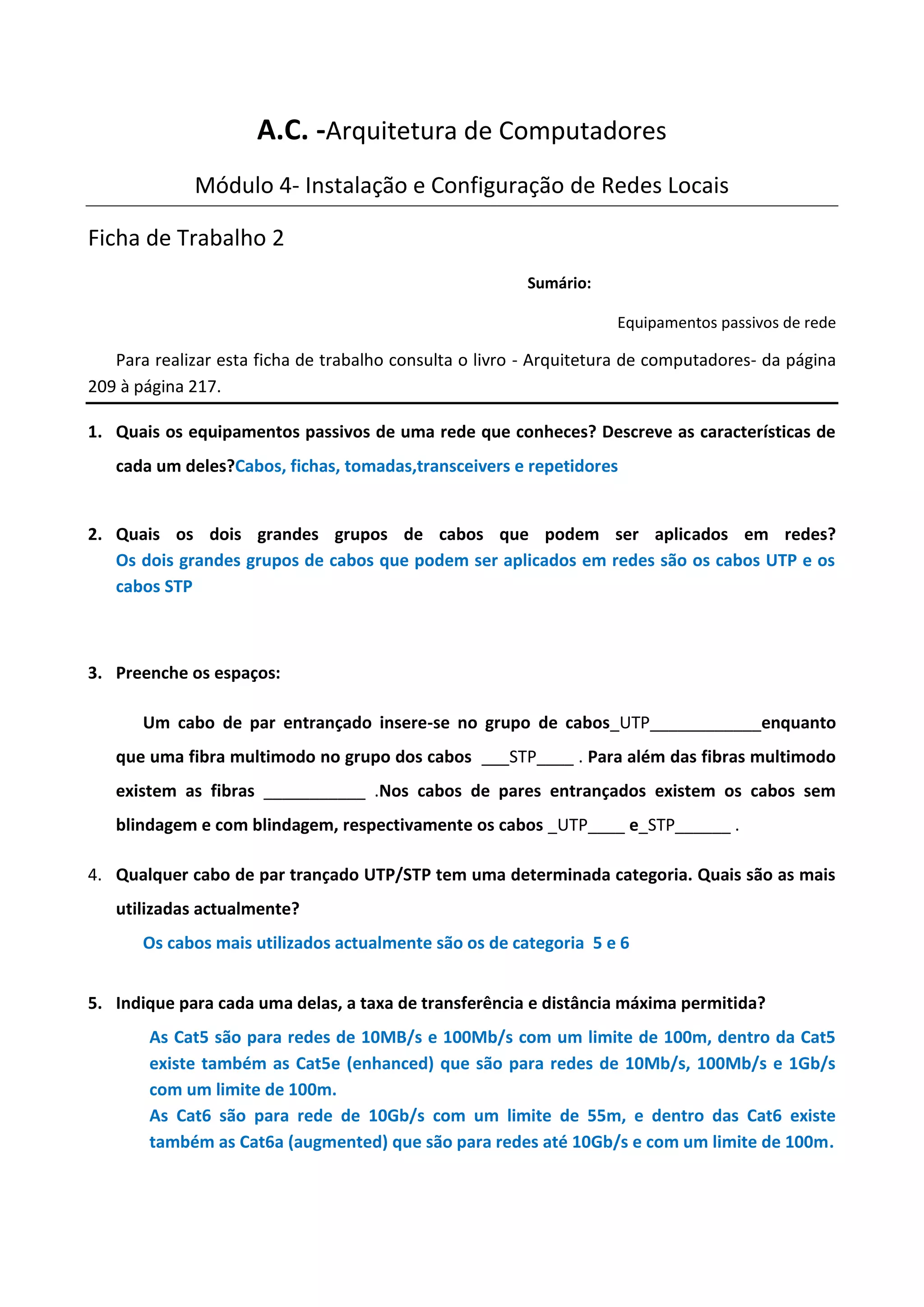 Equipamentos passivos de rede incluem cabos, fichas, tomadas e repetidores. Os dois principais tipos de cabos são cabos UTP não blindados e cabos STP blindados. Cabos UTP transmitem dados em redes de até 1Gb/s em distâncias de até 100m, enquanto cabos de fibra óptica STP suportam taxas mais altas em maiores distâncias.