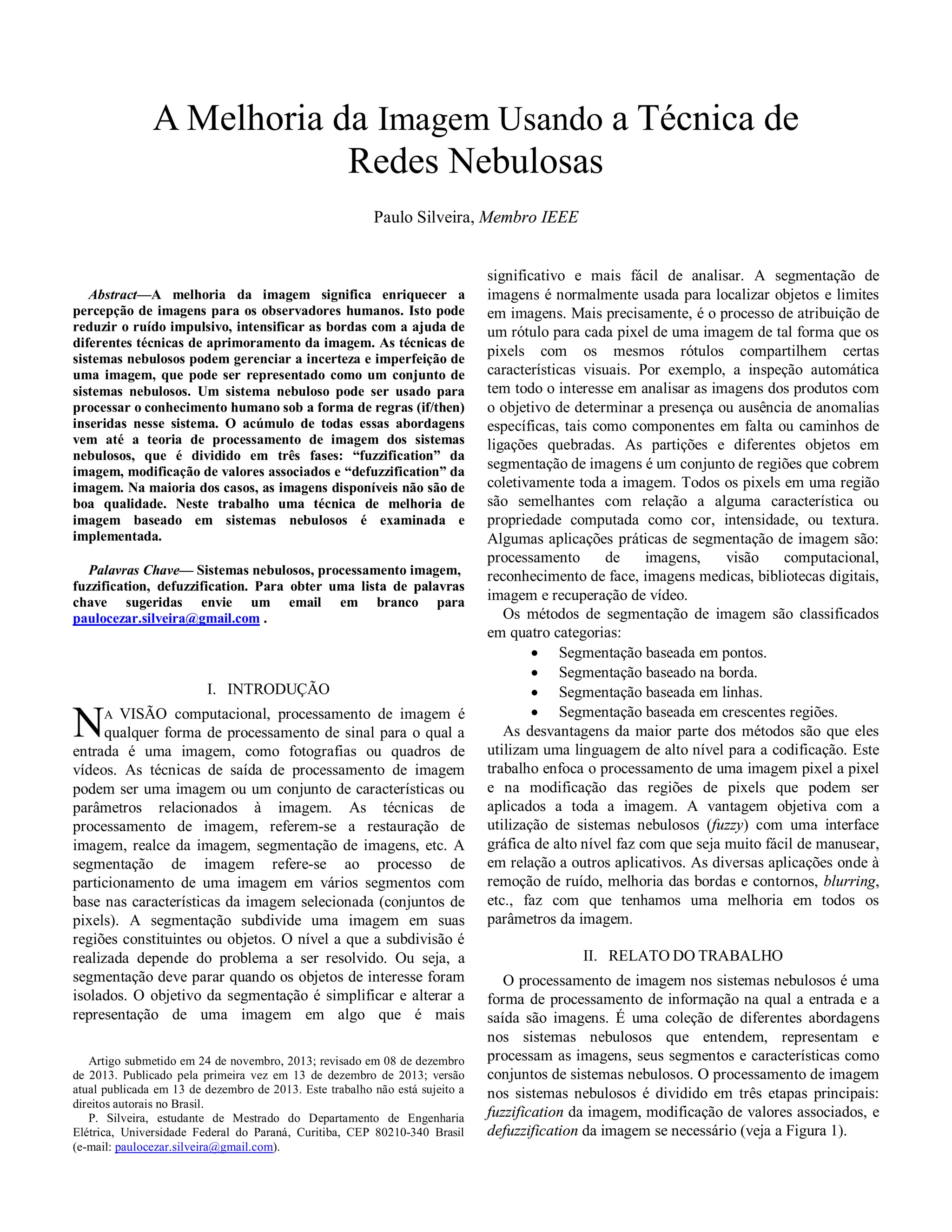 O artigo explora a melhoria de imagens utilizando técnicas de sistemas nebulosos, discutindo a redução de ruídos e aprimoramento de bordas através de um processo dividido em fuzzification, modificação de valores e defuzzification. A pesquisa demonstra a eficácia dessas técnicas em imagens de baixa qualidade, destacando a combinação do conhecimento humano com a estrutura numérica dos computadores. O método proposto possibilita um avanço em relação a abordagens tradicionais, mostrando resultados promissores na melhoria da qualidade das imagens.
