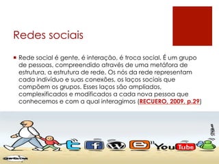 O documento aborda o conceito de redes sociais, destacando a interação e as conexões humanas como uma estrutura de rede. Discute também as mídias sociais como plataformas que viabilizam a troca de conteúdo criado pelos usuários, além de traçar a evolução do conceito de Web 2.0 e sua relação com a inteligência coletiva. A importância do capital social, visibilidade e autoridade nas interações sociais online é enfatizada, assim como a introdução de ferramentas como Twitter e Facebook na dinâmica das mídias sociais.
