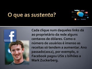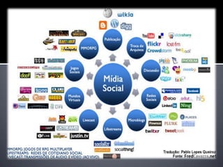 O documento discute o fenômeno das redes sociais desde sua origem na Internet em 1969. Apresenta redes sociais como agrupamentos de usuários virtuais com afinidades mútuas e explica que existem milhares de redes para satisfazer diferentes grupos. Também destaca que bilhões de pessoas estão conectadas em algum ponto do planeta através das redes sociais.