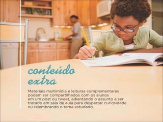 O documento discute como as redes sociais podem ser usadas de forma positiva no processo de ensino-aprendizagem. Ele fornece cinco formas como as redes sociais podem ser aliadas da aprendizagem, como mediar grupos de estudo, disponibilizar conteúdos extras, promover discussões, elaborar calendários de eventos e organizar chats para tirar dúvidas. Também destaca alguns cuidados que professores devem ter ao usar redes sociais, como estabelecer regras claras e não excluir alunos que não tem acesso