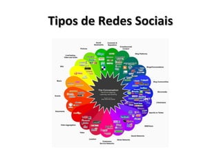 O documento descreve vários tipos de redes sociais, incluindo Orkut, Facebook, Twitter, MySpace, Flickr, Last.fm, Blogger e YouTube. Ele fornece informações sobre cada rede social, como número de usuários, características e informações adicionais sobre empresas e famosos que usam redes sociais.