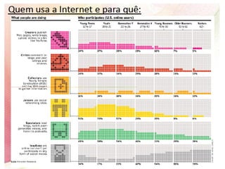 O documento discute as redes sociais, mídias sociais e colaboração em rede. Apresenta como as tecnologias alteraram as formas de comunicação e aquisição de informação. Também aborda como as redes sociais sempre existiram para atender à necessidade humana de comunicação e pertencimento, mas que as redes virtuais permitiram ampliar e complexificar essas conexões.