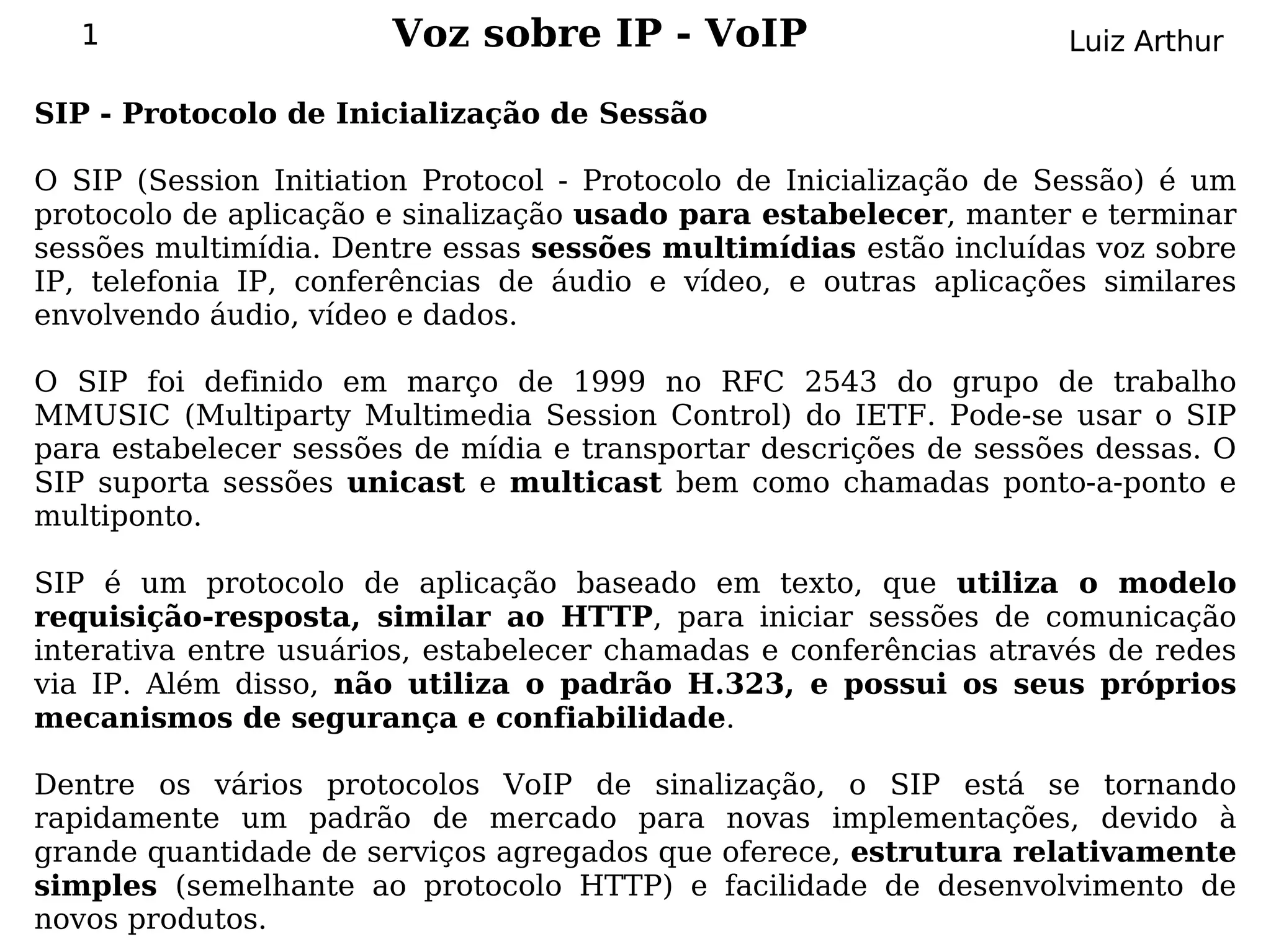 O documento descreve o protocolo SIP (Session Initiation Protocol), que é usado para estabelecer, manter e encerrar sessões multimídia sobre IP. O SIP define os principais componentes da arquitetura VoIP como User Agents e servidores como proxy, redirecionamento e registro. Além disso, explica os tipos de mensagens SIP como requisições INVITE, ACK, BYE e respostas.
